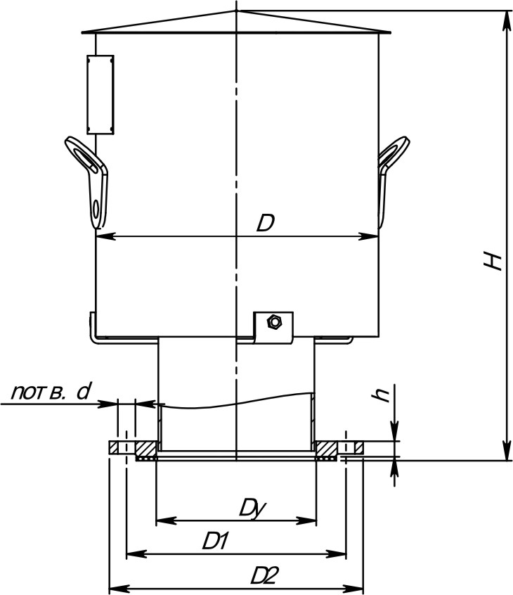 Для защиты от прямого воздействия атмосферных осадков и механических повреждений сетки на трубе установлен колпак, закреплённый болтами. ПВ должен устанавливаться на монтажный патрубок резервуара посредством болтового соединения.