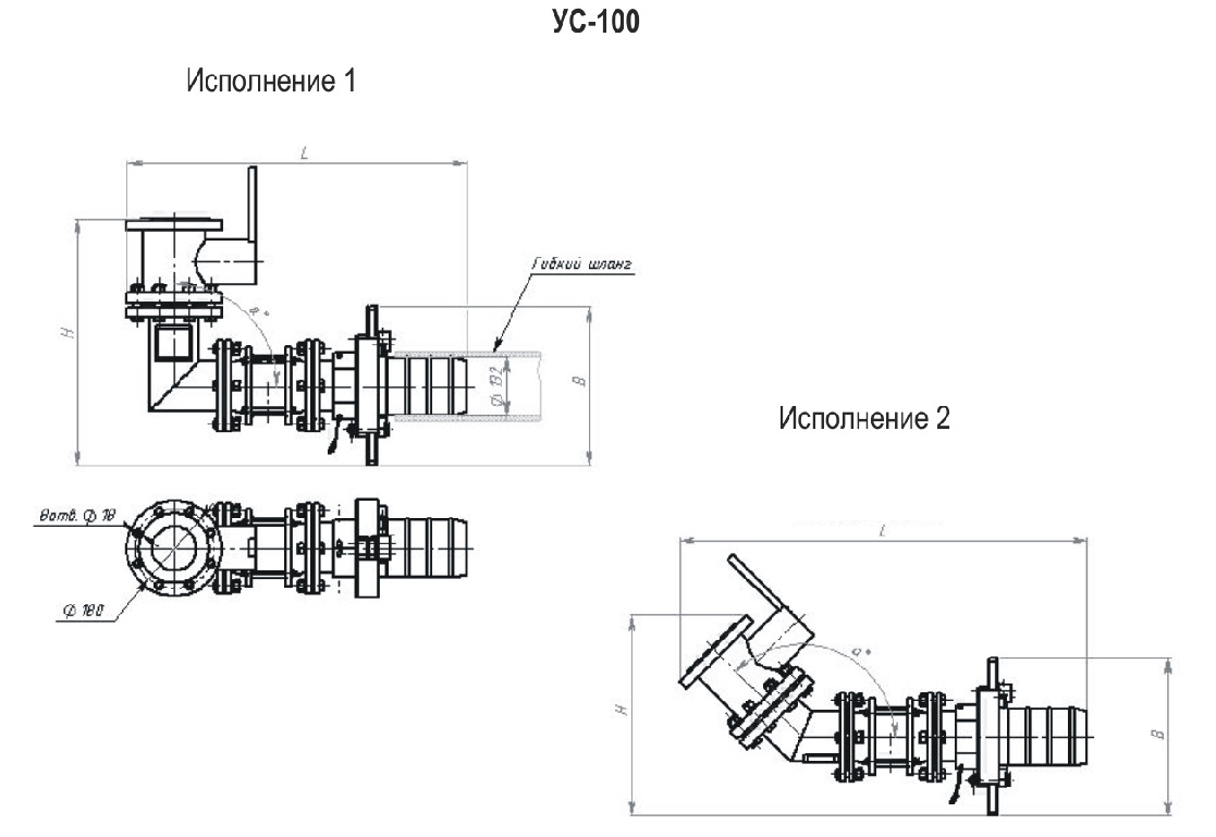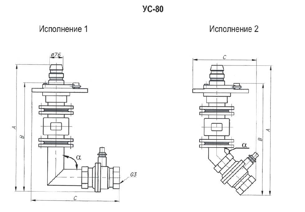Устройство изготавливается в двух исполнениях, отличающихся друг от друга углом патрубка a: 1 исп. α = 90о, 2 исп. α = 135о.